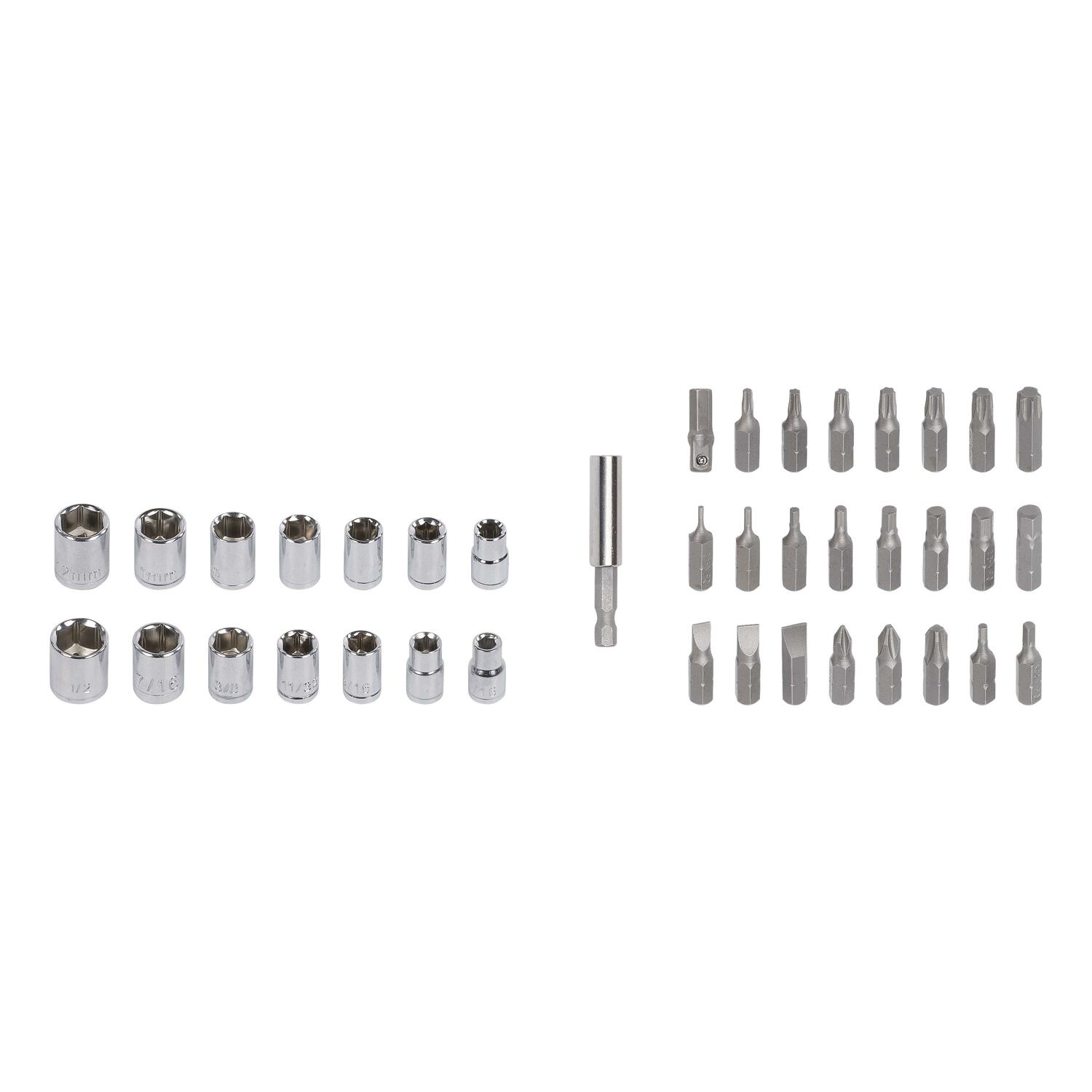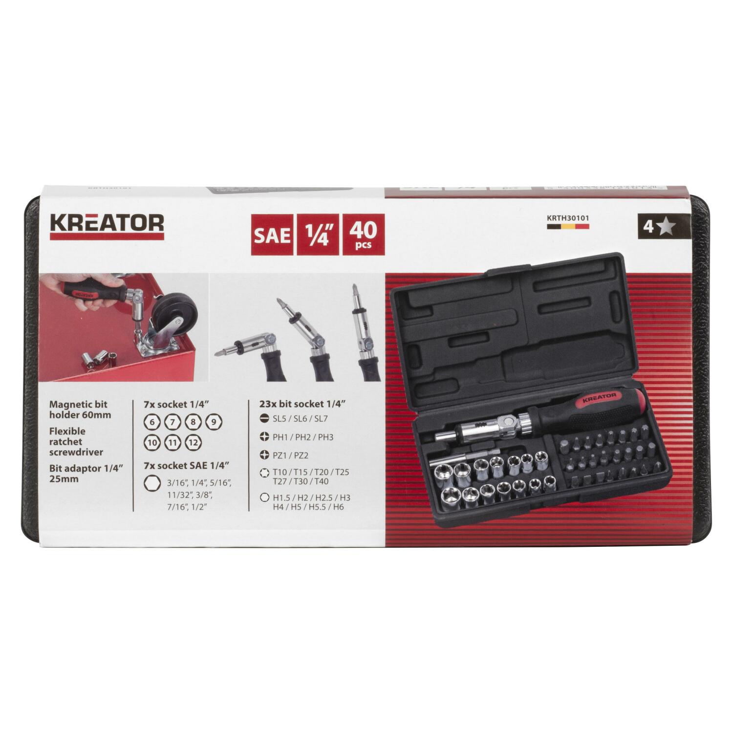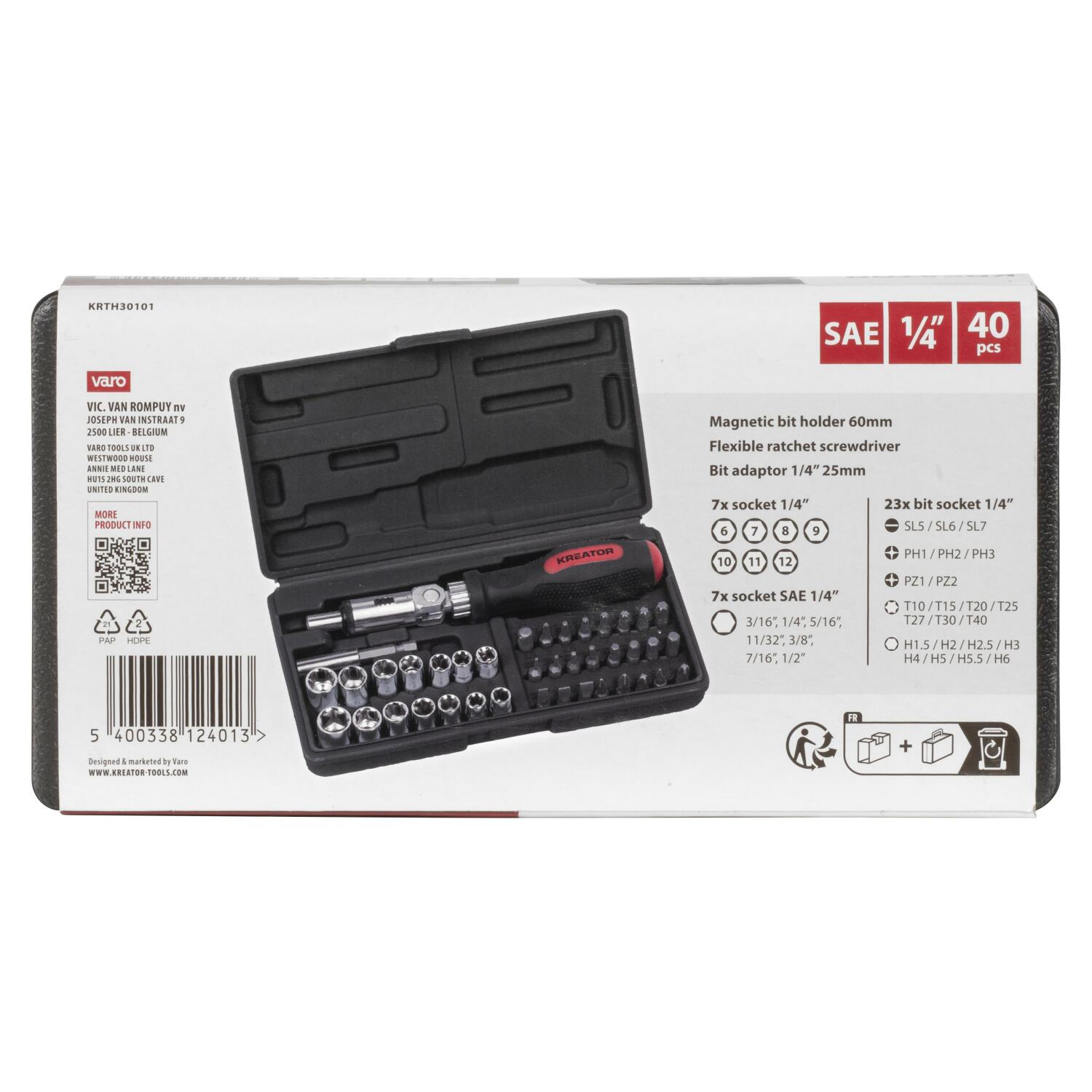 See on ulatuslik 40-osastmeline käepidemega kruvikeeraja komplekt. Pead saab kallutada, mis tagab vajaliku paindlikkuse ja võimaldab teie jõu paremat kasutamist. Kompaktne sisaldab ka paindlikku kruvikeerajat ergonoomilise pehme käepideme ja libisemisvastase kattega, samuti 14 mutrivõtit, 23 kruviotsikut, magnetilist bitihoidjat ja bitide adapterit. Komplekt tuleb praktilises säilituskohvris.
