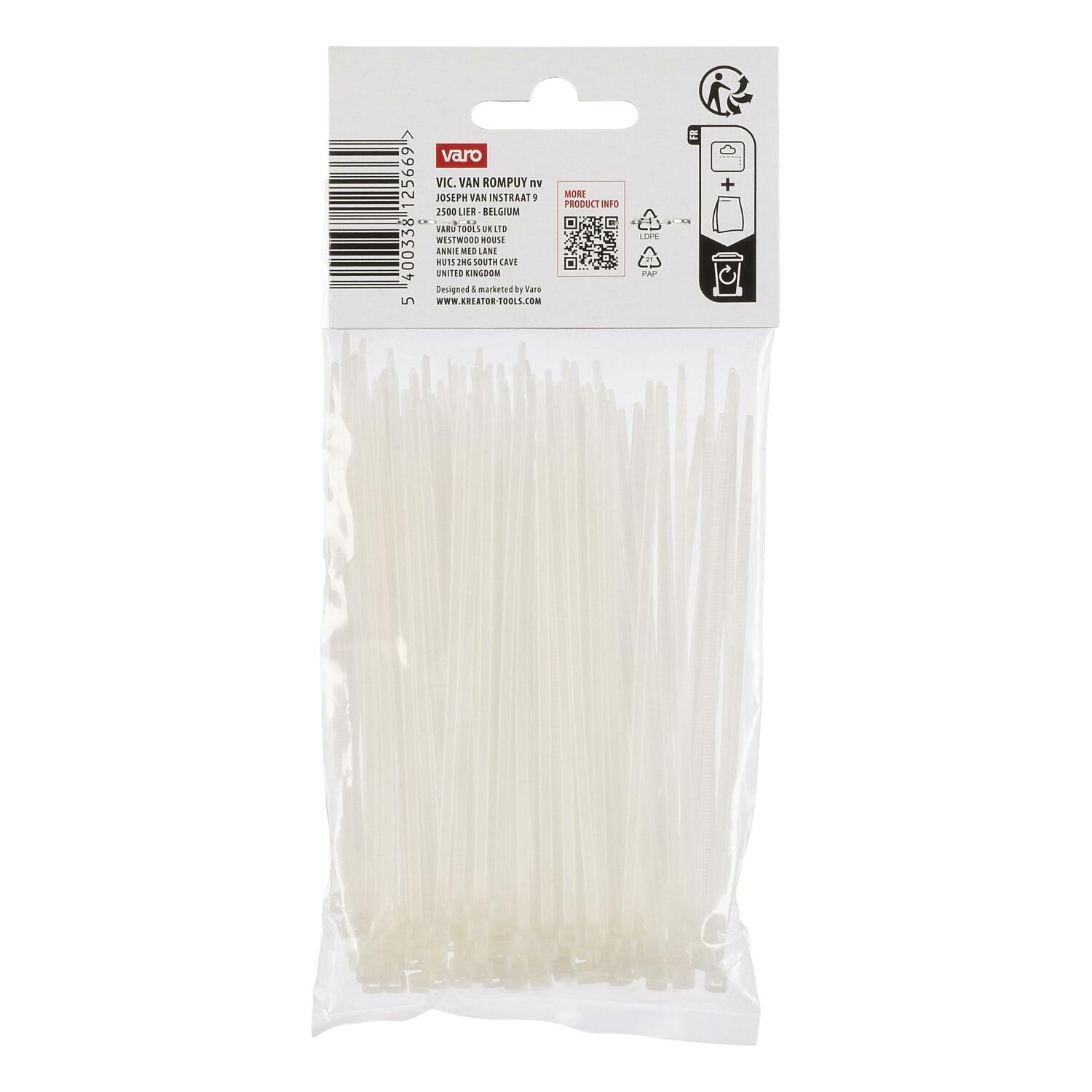 See komplekt sisaldab 100 valgest nailonist kaablisidet mõõtmetega 120 mm x 2,5 mm. Tugevad kaablisidemed omavad kõrget venitusjõudu. Kasutage neid kaablite korralikuks kokku sidumiseks või esemete omavahel kergesti kinnitamiseks. Näiteks võite oma kontoris või töötubades kaableid ja juhtmeid korralikult peita, sidudes need selle komplekti kaablisidemetega.