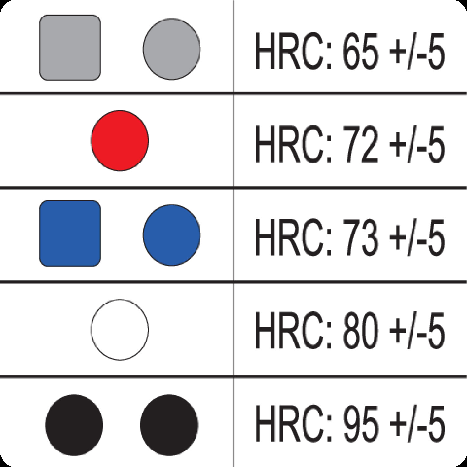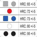 | Cietība, HRC | 60 — 70; 67 — 77; 68 — 78; 75 — 85; 90 — 100 |