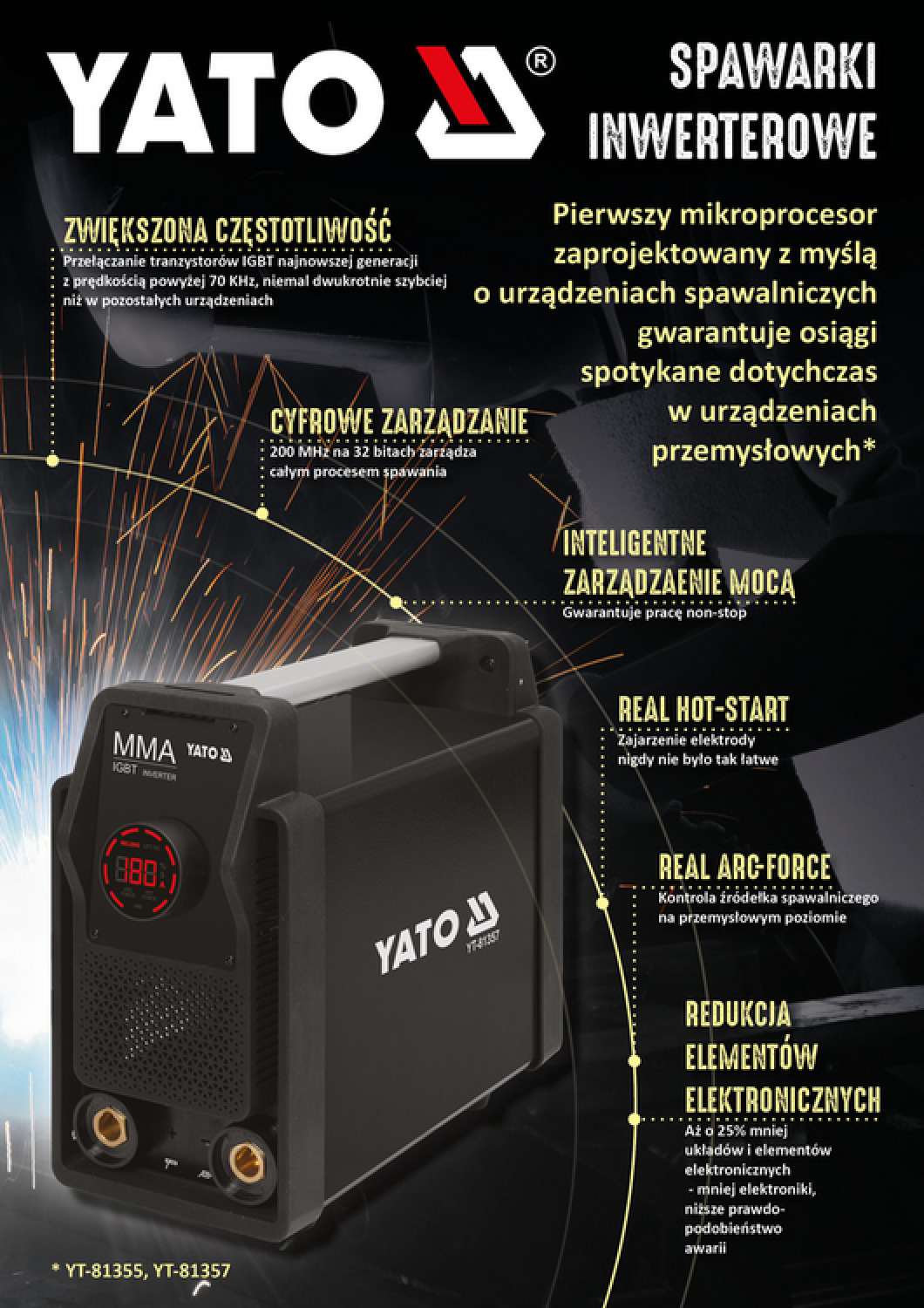 Aizsardzība pret pārslodzi un pārkaršanu (ventilators pēc pieprasījuma) - YT-81355 mikroprocesors reālā laikā pārbauda kritisko komponentu temperatūru. Atkarībā no temperatūras tas vispirms kontrolē ventilatora ātrumu, bet, kad temperatūra sasniedz pārāk augstu līmeni, mikroprocesors pakāpeniski samazina izejas strāvu, ļaujot elektrodam izdegt vai metināšanai apstāties kontrolētā veidā. Lielākajā daļā metināšanas mašīnu tirgū, ja rodas pārkaršana, metināšanas strāva tiek momentāni izslēgta, kas bieži beidzas ar nepieciešamību veikt mehāniskas regulēšanas metināmo detaļu. Šī problēma nenotiek ar YT-81355.