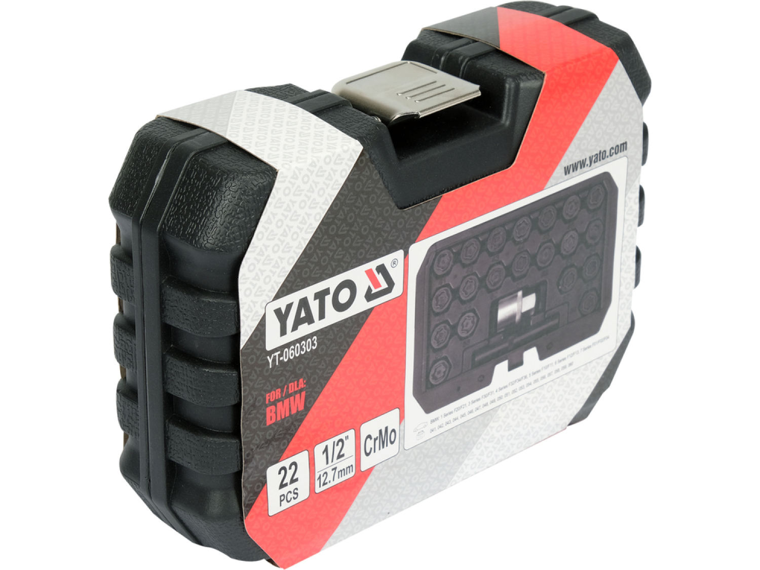 Riteņu skrūvju uzgaļu komplekts YT-060303 no YATO ir būtisks instruments, lai droši nostiprinātu riepu skrūves. Šis komplekts ir īpaši izstrādāts BMW automašīnām, nodrošinot optimālu pielāgošanu un stabilitāti.