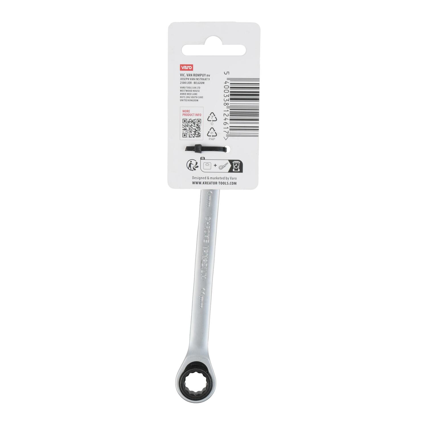 Šī KREATOR kombinētā atslēga ar reverso mehānismu ir 167 mm gara un izgatavota no augstas kvalitātes hroma-vanādija. Tai ir gredzena izmērs 11 mm.