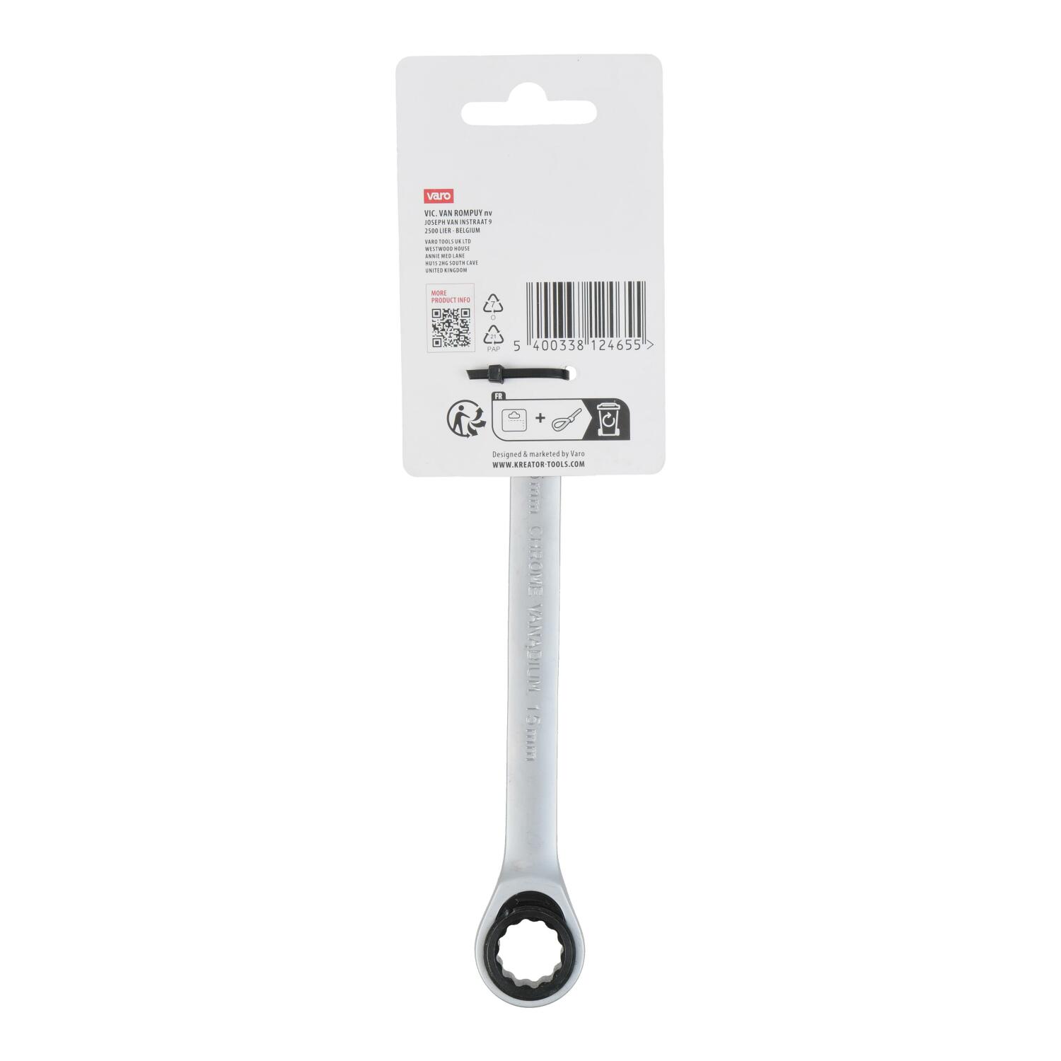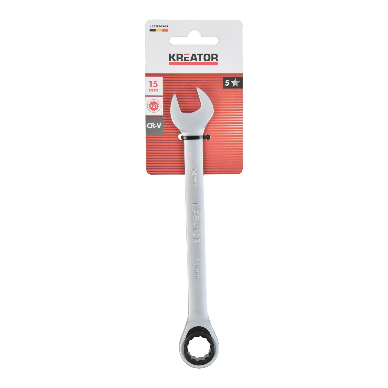 Šis kombinētais reversais uzgriežņu atslēga no KREATOR ir 203 mm gara un izgatavota no augstas kvalitātes hroma-vanādija. Tā ir aprīkota ar 15 mm gredzena izmēru.