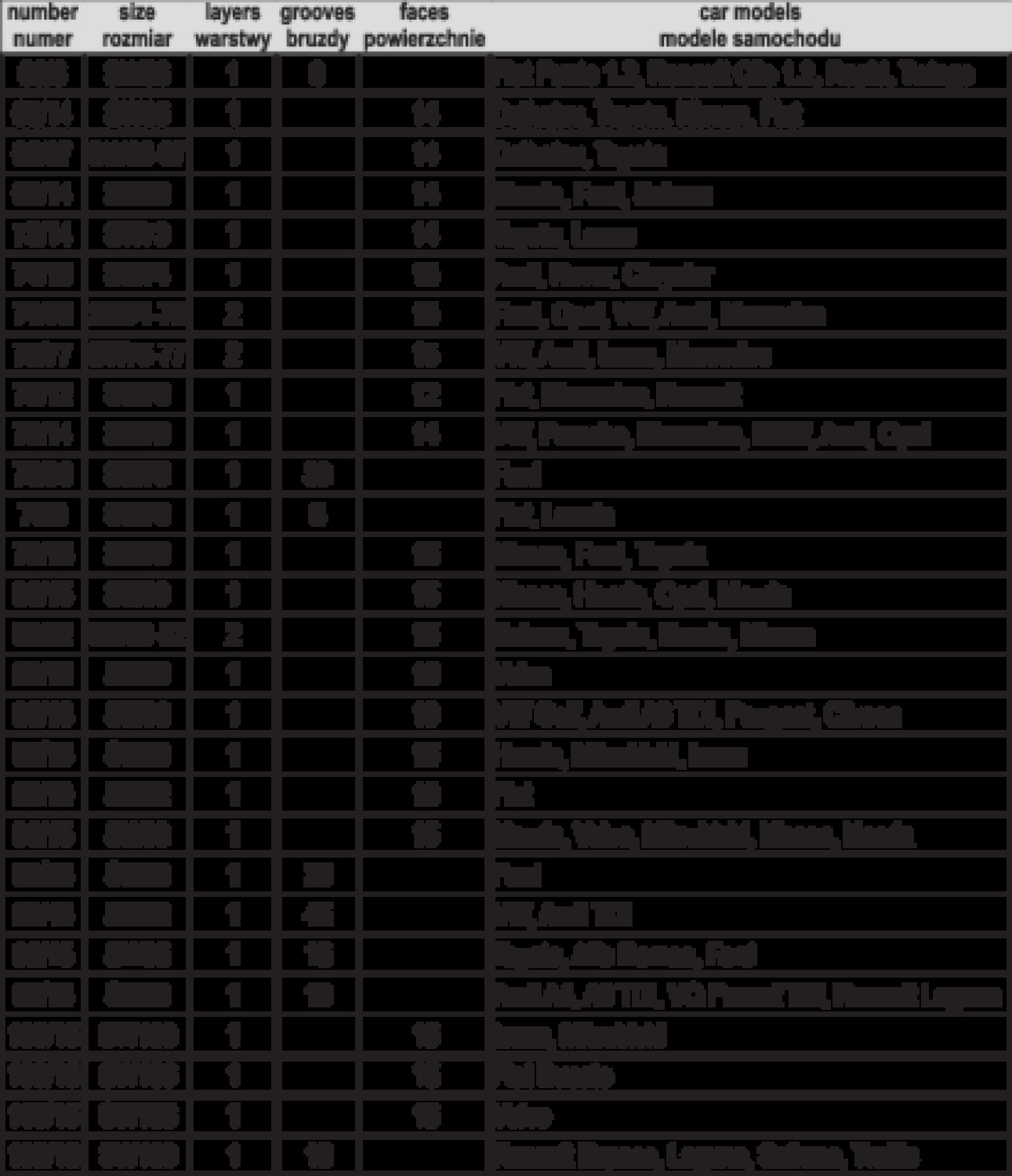 | Izmērs | 108/18GROOVE; 65/14TH; 65/67TH; 66/6GROOVE; 68/14TH; 73/14TH; 74-76/15TH; 74/15TH; 75-77/15TH; 76/12TH; 76/14TH; 76/30GROOVE; 76/8 GROOVE; 78/15TH; 80/15TH; 93/36 GROOVE; 93/45GROOVE; 95/15GROOVE; 96/18GROOVE |