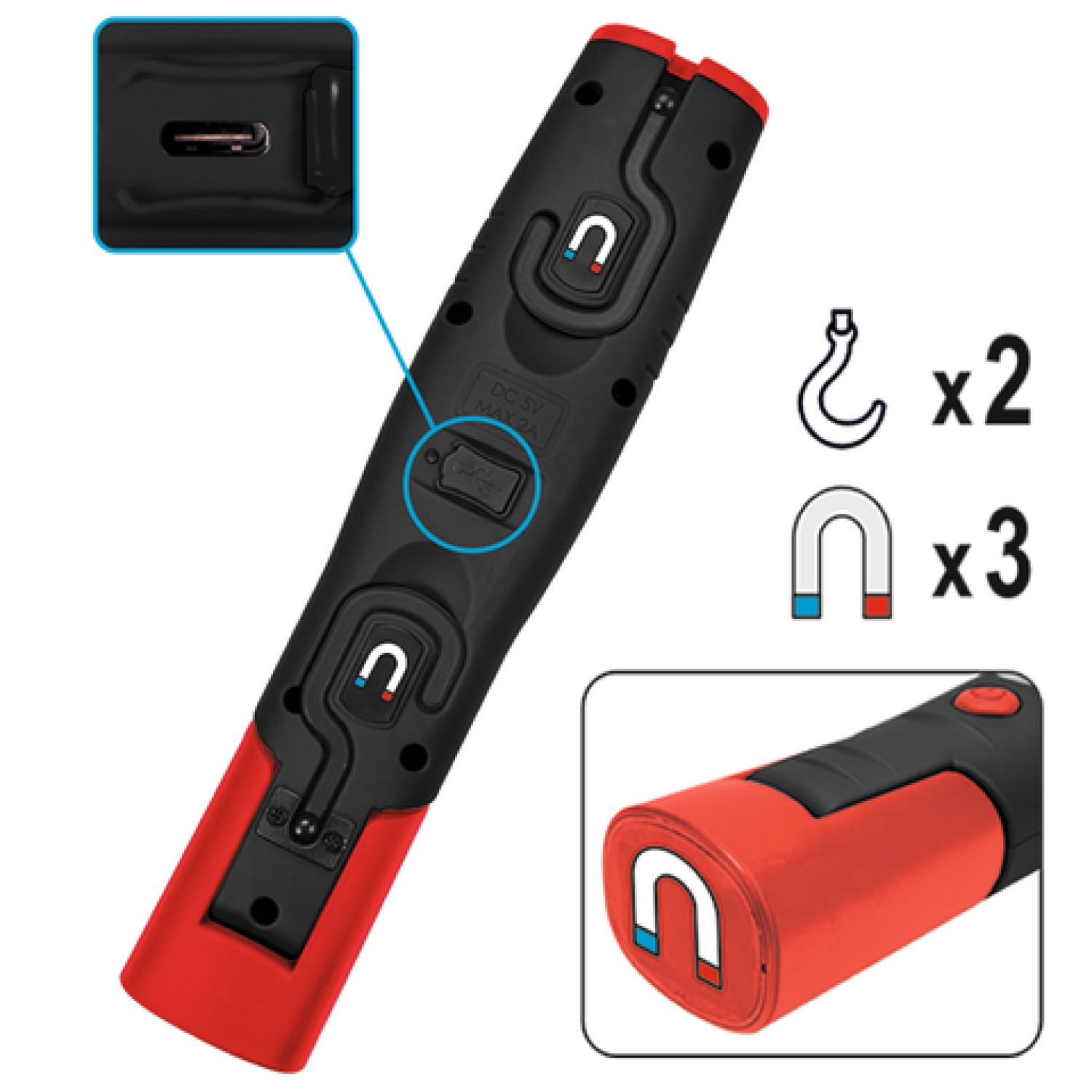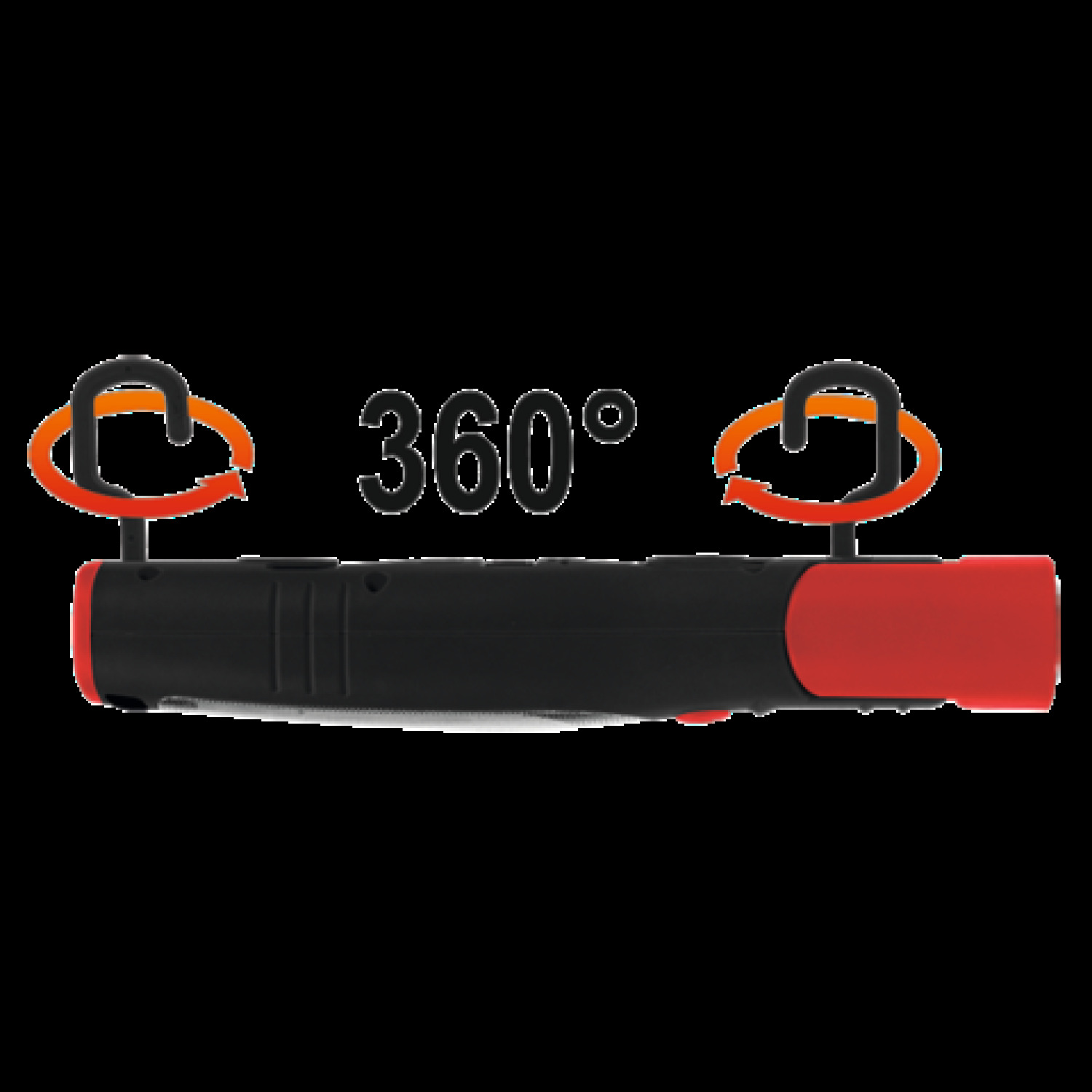 Rotējošais korpuss ļauj lampai leņķi pielāgot jebkurā virzienā. Pateicoties šai funkcijai un diviem āķiem un trim magnētiem, to var viegli un elastīgi nostiprināt. Tas dod iespēju optimāli apgaismot izvēlēto telpu, atstājot rokas brīvas.