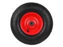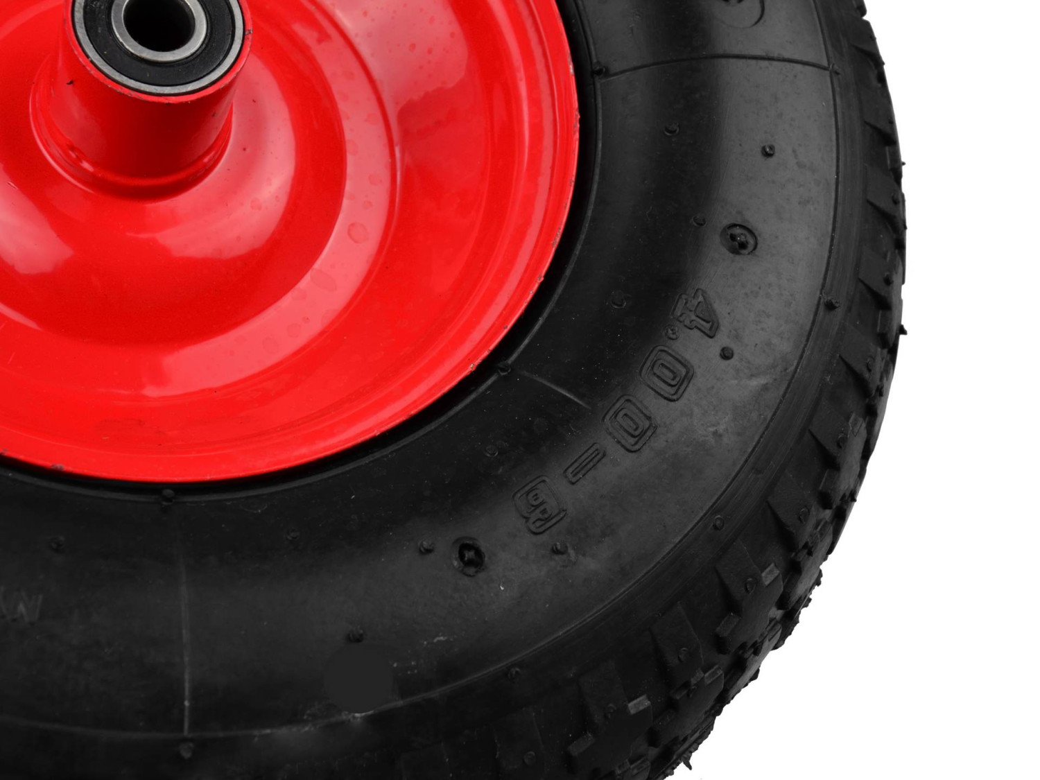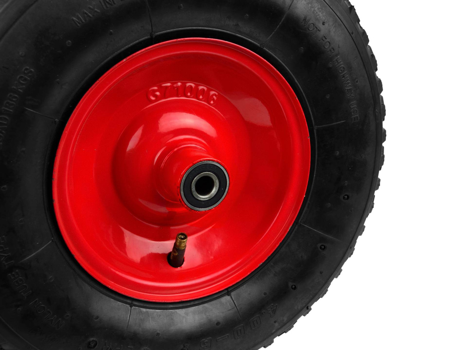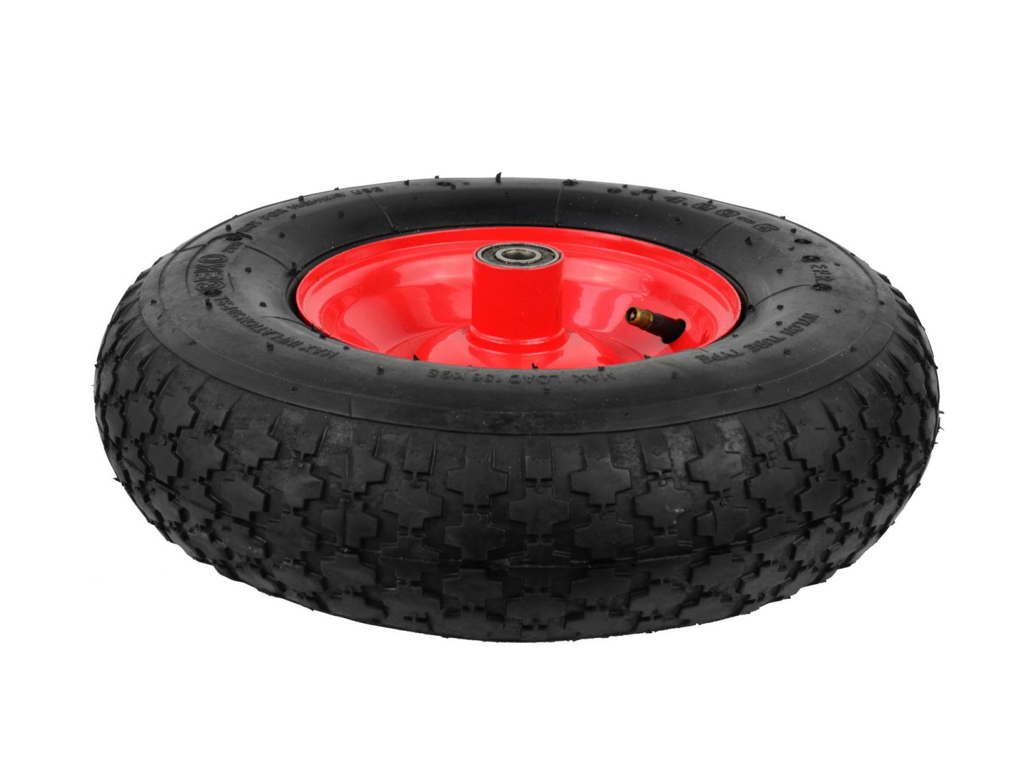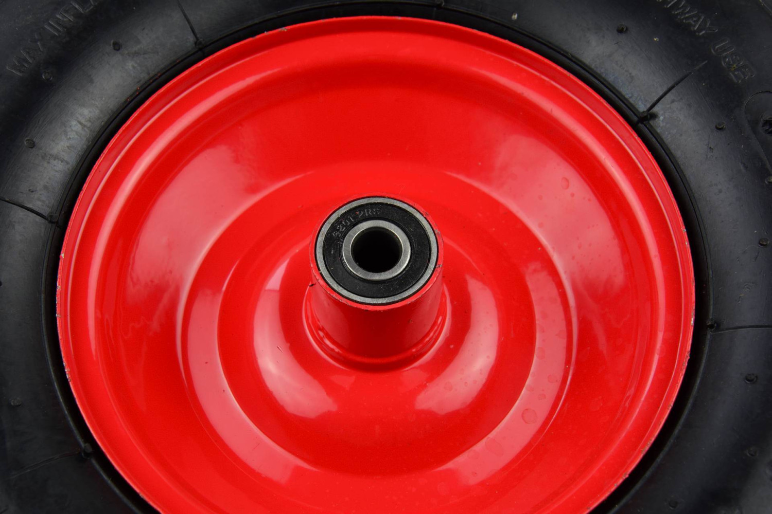 Kvalitatīvs ķerras ritenis ar pneimatisko 4.00-6 izmēra gumijas riepu un izturīgu metāla disku, paredzēts slodzei līdz 90 kg. Šis modelis ir viegls, bet vienlaikus izturīgs, pateicoties 2PR karkasam un pneimatiskajai struktūrai, kas nodrošina labu amortizāciju un saķeri ar dažādām virsmām. Sarkanais pulverkrāsas pārklājums aizsargā disku no rūsas un mehāniskiem bojājumiem. Ideāli piemērots dārza, saimniecības un būvniecības ķerrām ikdienas lietošanai.